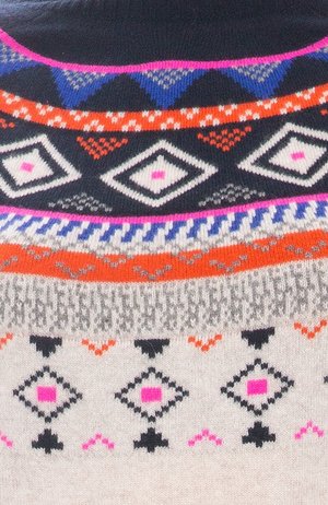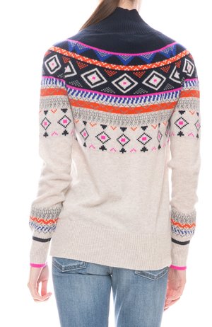 Autumn Cashmere fair isle pullover cashmere sweater with ribbed mock neck. Ribbed cuffs and hem. Lightweight and super soft. Model is 5' 9" wearing size S. Made with 100% Cashmere.