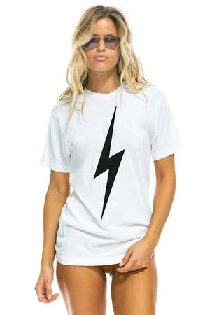 An Aviator Nation take on the classic bolt design - this tee is built for speed. All of our products go through an intense breaking-down process that gives them a vintage feel you'll love because it's broken in from day one of wearing it. You're going to live in this tee. - Tees are UNISEX sizing - Male model wearing size L. Female model wearing size S. - Hand sewn in our own factory in the heart of Los Angeles - Tri-Blend Fabric: 50% Cotton, 37% Polyester, 13% Rayon - Machine wash cold with like colors. Hang or tumble dry on low.
