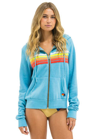 The Aviator Nation 5 Stripe Zip Hoodie features single needle stitch work for a unique effect. Each hoodie goes through a special breaking-down process for a vintage feel from day one. - Hand sewn in Los Angeles - Tri-Blend Fabric: 50% Cotton, 37% Polyester, 13% Rayon - Machine wash cold with like colors. Hang or tumble dry on low. - Hoodies are UNISEX sizing