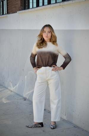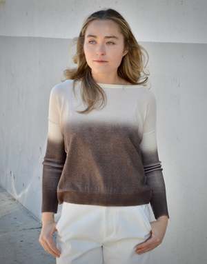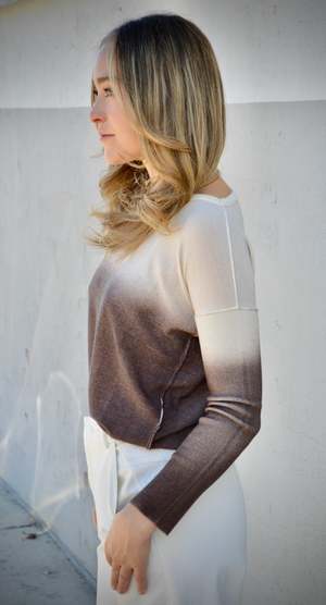 Lightweight virgin wool, silk, and cashmere blend sweater. Dip-dyed for a gradient coloring in earthy tones. Extra soft.