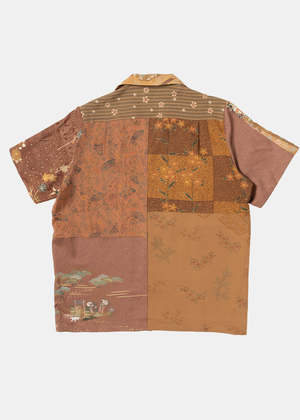 Silk kimono patchwork shirt in brown. Short sleeve Front chest pocket Straight hem 100% Silk Made in China. *PATCHWORK/ PATTERN WILL DIFFER WITH EACH ITE...