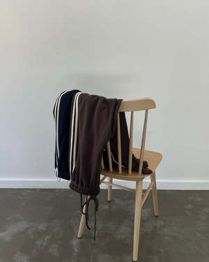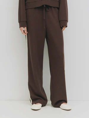 The Ezra Pants effortlessly blend sporty style with relaxed comfort. Featuring a wide-leg fit and a soft, elastic drawstring waistband, they are perfect for both active days and laid-back moments. Crafted from a cozy midweight waffle knit, they are finished with stylish double stripes down the sides and a convenient back patch pocket for a modern, athletic edge. Fabric: Self: 65% Polyester, 35% Cotton; Combo: 92% Viscose, 8% Spandex.