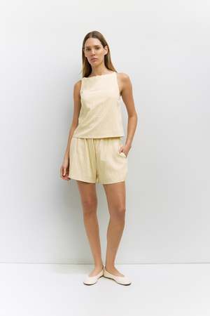 The Alana Shorts are crafted from a lightweight rayon blend and designed with an easy, relaxed silhouette. An elastic shirred waistband offers a comfortable, flexible fit, while front slit pockets add everyday functionality. Fully lined for a smooth feel, theyre made to pair effortlessly with the matching Alana Top for a polished set or styled separately for warm-weather dressing. Details: 85% Rayon, 15% Nylon Lining: 100% Rayon Lightweight fabric Elastic shirred waistband Front slit pockets