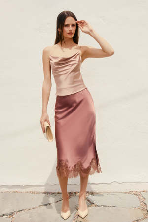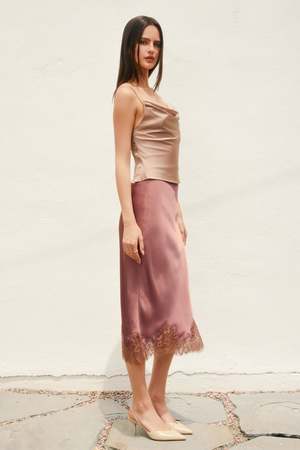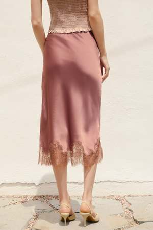 Satin midi skirt with an A-line silhouette and lace hem. Features a pull-on style with an elastic waistband, side slit, and full lining. Model is 5'9" and is wearing size Small. Shell: 100% Polyester Lining: 95% Polyester, 5% Spandex