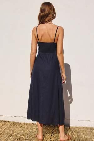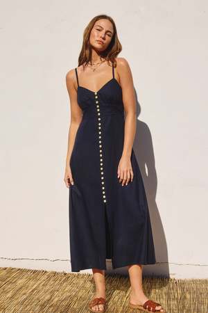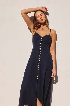 Azalea | Ruby Midi Dress So chic. Navy midi dress with button down detail. Has lining. Shell - 70% cotton, 30% linen Lining - 100% cotton