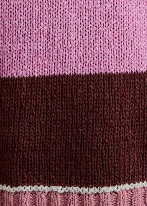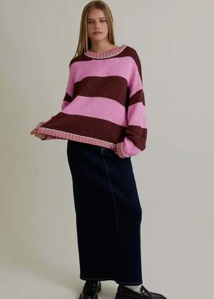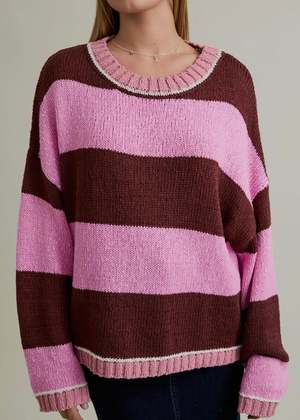 Add a playful pop of color to your fall lineup with this cozy oversized sweater in wide pink and chocolate stripes. Crafted from a soft, mid-weight knit, its the perfect mix of comfort and statement style. The relaxed fit and drop shoulders give it that effortless, lived-in feel youll reach for all season long. Pair it with vintage denim or a slip skirt for a casual-cool look that transitions seamlessly from day to night. Model is wearing a size small. Model specs: Height: 5'8" Bust: 32B Waist: 24" Hips: 34" Details: - Oversized fit with drop shoulders - Wide pink and brown stripes - Ribbed neckline, cuffs, and hem - Soft, mid-weight knit for easy layering - Perfect fall sweater for effortless everyday wear