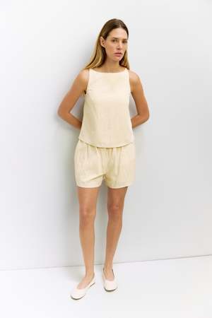 The Alana Top is crafted from an airy rayon blend with a relaxed, sleeveless silhouette. A wide neckline creates a clean, modern shape, while an invisible side zipper offers a seamless finish. Designed to pair effortlessly with the matching Alana Shorts, its an easy piece for warm days and elevated casual styling. Details: 85% Rayon, 15% Nylon Lining: 100% Rayon Lightweight fabric Sleeveless Wide neckline Invisible side zipper