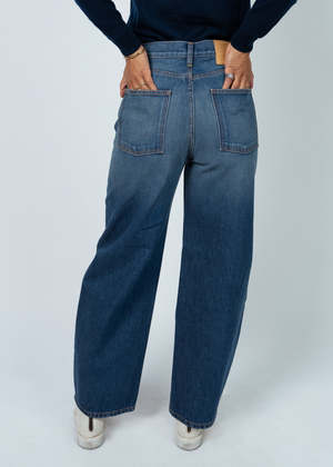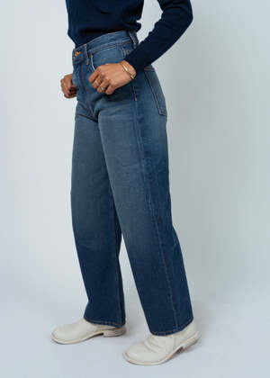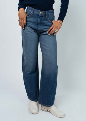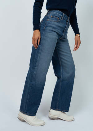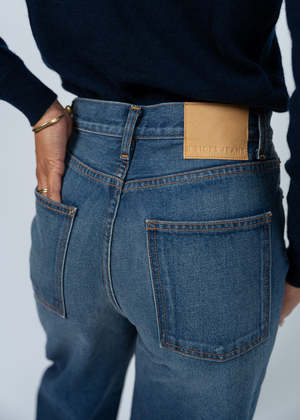 B Side's Eshel Jeans sit at the natural waist and have a relaxed straight leg with a subtle kick flare shape. Details: - Zip fly and brass button closure. - Sits at natural waist. - Relaxed leg. - Subtle kick flare. - Machine wash. Tumble dry. - Made in USA. 100% cotton.