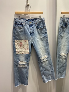 B Sides with antique floral patches. Relaxed through hip and thigh. Broken in straight leg. Open split seamed hem. 37" long 11" inseam. Machine wash, tumble dry or lay flat. 100% cotton 14 oz indigo dye. One of a kind. Soft broken in feel. Zip fly with signature brass button top.