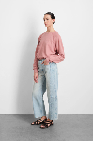 By B Sides The orginal Lasso Jean cut from heavy cotton rich indigo denim, that has been lifted to soften the hue-- then finished for a relaxed structured look. Designed to sit at the natural waist with a pieced outseam, kinked leg shape and frayed hem. Sits at the waist A slim-slouchy fitting jean, with shaped outseam Light vintage wash