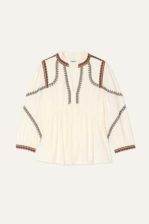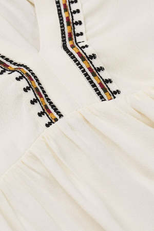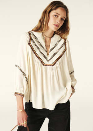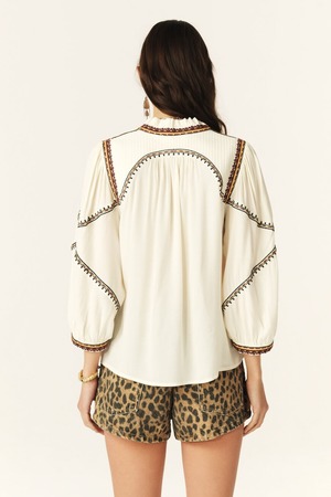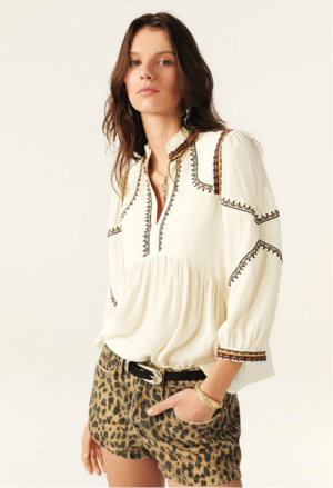 Upgrade your summer wardrobe with the charming Talsie Blouse by ba&sh. This airy piece features a V-neckline, long puff sleeves, frilly collar, and quilted insert, adorned with tone-on-tone topstitching and multicolored embroidered details. It's the perfect flowy and bohemian addition for a casual retail look.
