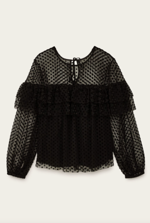 Sheer mesh fabric with dotted swiss effect. Round neck with tie detail at back and opening. Full fluid style with panel detail and two ruffles continuous with the sleeve just above the chest. Layered top and bustier effect. Cuff with 3 buttons. Romantic boho seventies style. Fabric: 65% Polyamide, 35% Polyester Wash at 30, do not bleach, iron at a maximum temperature of 110, dry clean only, do not tumble dry. Made in China. Fits true to size. We recommend taking your regular size.
