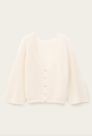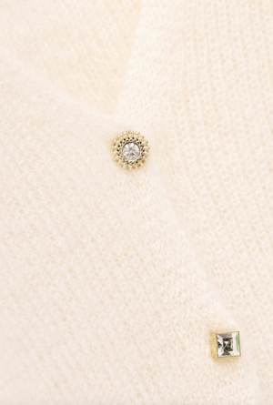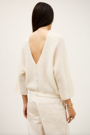 Three-quarter sleeved sweater with wide sleeves and a deep V-neckline at the back. Embellished with rhinestone buttons. Can be worn either front to back or back to front. Fabric: 39% Polyamide, 31% Mohair, 30% Alpaca. Made in Italy. Fits true to size. Take your regular size.
