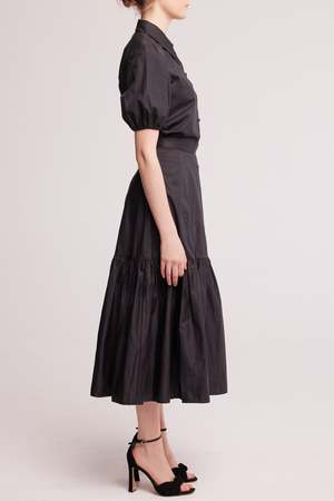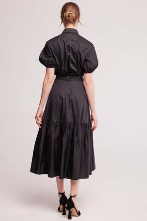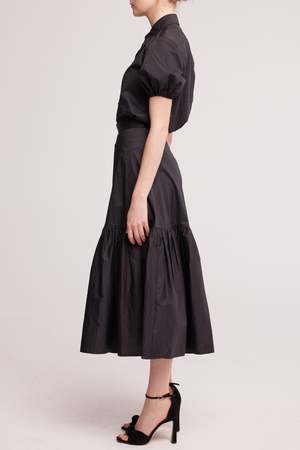 A full skirt with an a-line hip and an exaggerated gathered hem, cut from a cool and crisp cotton poplin. Featuring a cinched waist and a fabric covered button at the centre back for a vintage touch. Complete the look with the Puff Sleeve Shirt. - Made in Australia - Zip and button back closure - Total length 90cm - Model is 178cm / 5'10" tall and wears a size 8 Fabric & Care 100% cotton. Medium weight fabric, feels soft on the skin. Cold hand wash or dry clean. Do not tumble dry. Line dry in the shade. Cool iron or steam. This product is made-to-order which means no waste.