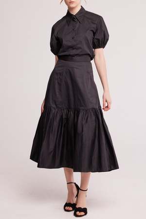 A beautiful crisp cotton shirt for any occasion. Featuring puffy sleeves, a pointy collar and Baabys signature fabric covered buttons for a vintage touch. Worn with the Frou Frou Skirt. - Made in Australia - Silky finish cotton fabric - Self covered buttons - Elasticised sleeve opening - Extended pointy collar - Model is 178cm / 5'10" and wears a size Fabric & Care 100% Cotton Light weight fabric, feels soft and cool on the skin. Cold hand wash or dry clean. Do not tumble dry. Line dry in the shade. Cool iron or steam. Sustainability & Ethics This product is made-to-order which means no waste.