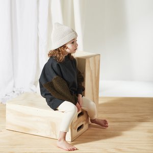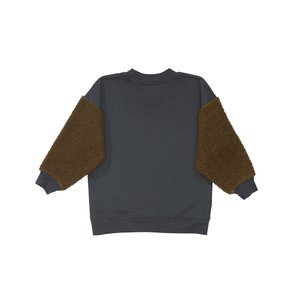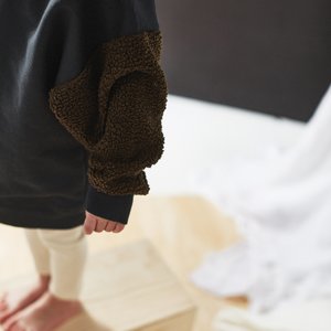 New from Bacabuche for Autumn / Winter 2019. Washed black organic cotton sweatshirt with olive green color-blocked faux sherpa sleeves. - Unisex baby and kid's sweater - Body: 100% organic cotton - Sleeves: 100% poly sherpa - Color: Washed Black / Olive - Long, baggy cut sherpa sleeves in contrasting color - Crewneck - Dropped shoulders - Ribbed neckline, cuffs, and waistband - Relaxed fit - Model is wearing one size larger for oversized styling