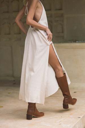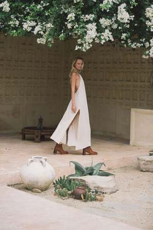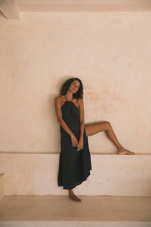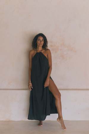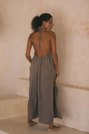 BAHHGOOSE SIGNATURE HAI DRESS Features an adjustable drawstring necktie. Elegant low back with hidden drawstring to tighten or loosen for desired fit. Signature high side slits creating a lightweight flow. Model wears size XS/S. Available in natural, taupe & charcoal cotton crinkle.