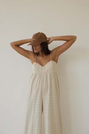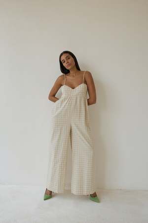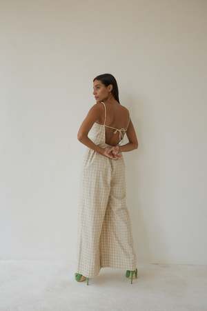 BAHHGOOSE SIGNATURE RIO JUMPSUIT Maxi Length Jumpsuit, features adjustable straps, elegant open back. Wide legged oversized fit. Carol wear XS/S 30% cotton 70% linen