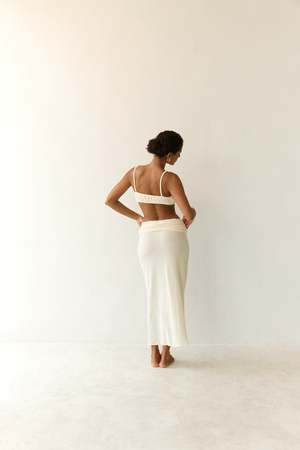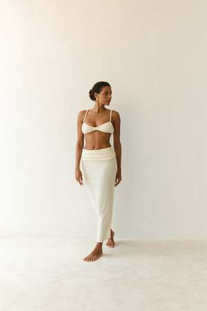 Crafted in our beautifully textured cotton ramie. Optional high / low waist fit, double layer ruched waist.