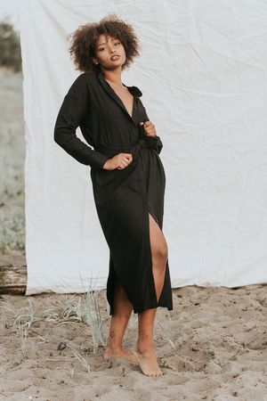 BAHHGOOSE SIGNATURE INGE BUTTON UP Made from 100% raw silk. This piece is a perfect addition to any wardrobe, with its natural fibres bringing you from summertime heat to falltime chill. This unique fabric is both trans seasonal and timeless. Details: Button up Belt NOT included Side Slits Front Pocket Available in Ivory or Black 100% raw silk Model wears size S/M in black raw silk