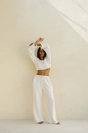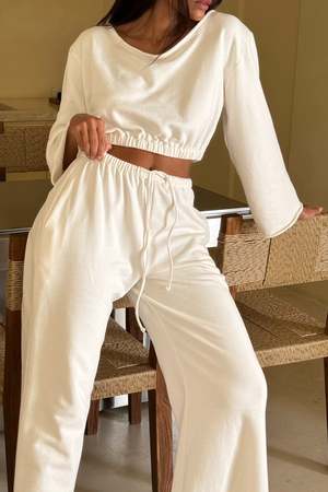 BAHHGOOSE NEEN SWEATER Your favourite NEEN TOP now available as the NEEN SWEATER. Elastic fitted crop style. Wide neckline with optional off the shoulder wear. Raw roll sewn sleeve. Carol wears XS/S 100% cotton