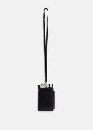 Calfskin phone holder in black. Semi-matte texture. Removable shoulder strap. Logo. Back pocket. Zip closure. 70% Calfskin, 15% Polyurethane, 15% Cellulose. Made in Italy.