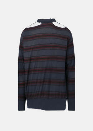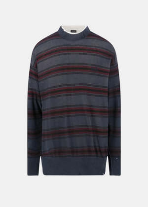 Cotton blend layered striped sweater in black and multicolor with horizontal stripes, embroidered logo2, distressed detailing, round neck, and long sleeves. 78% Cotton, 22% Silk. Made in Italy.