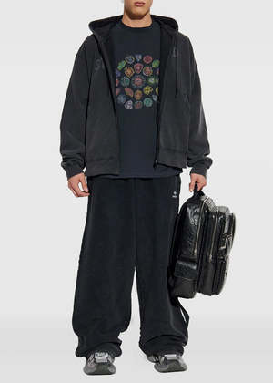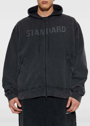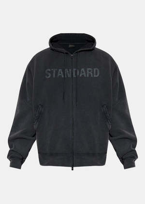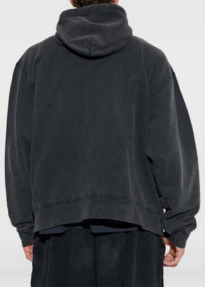 Cotton oversized zip up hoodie in washed black. Features a drawstring hood, front zip fastening, front pockets, long sleeves, and tonal lettering print. 100% Cotton Made in Italy.