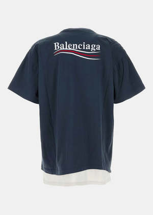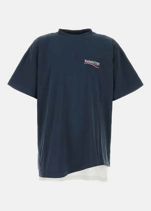 Cotton layered T-shirt in marine blue with a graphic logo2 and curved hemline. Layered design Short sleeves Graphic logo2 Curved hemline 100% Cotton Made in Italy.