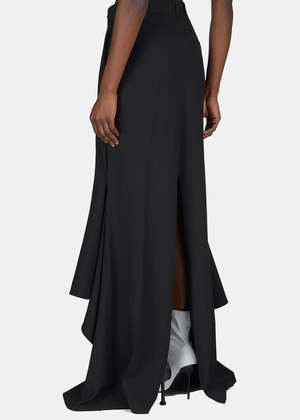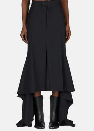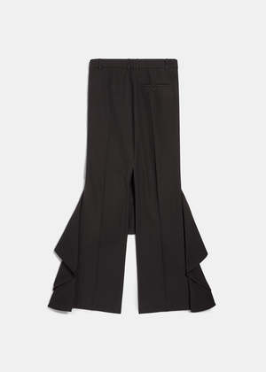 Virgin wool blend Godet Skirt in black. Regenerative tailoring wool Regular fit Multiple styling possibilities Tailoring pants at back Godet skirt at front High waist 6 belt loops Covered zip fly 2 slash pockets. 73% Virgin Wool, 27% Viscose. Made in Italy.