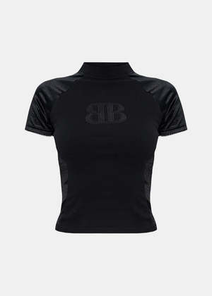 Cotton interlock fitted top in black. Features stretch jersey fabric, a small fit, and short sleeves. 100% Cotton. Made in Italy.