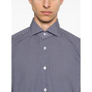 Men > Clothing > Shirts Midnight blue, white, and light blue cotton shirt featuring an all-over graphic print, classic collar, front button fastening, long sleeves with buttoned cuffs, and a curved hem.