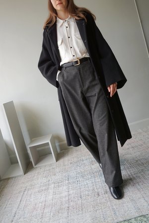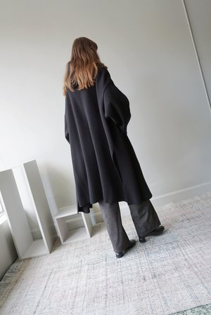 BARENA ARDEO COAT IN BLACK. THIS COAT IS MADE FROM A DOUBLE KNIT WOOL BLEND AND IS CUT WITH A BIT OF A SWING. FEATURES A DROPPED SHOULDER, HOOD, PATCH POCKETS AND SIDE SLITS. BUTTON FRONT CLOSURE AND RAW EDGE AT STRAIGHT HEM AND SLEEVE. UNLINED. CENTRE BACK MEASURES APPROXIMATELY 43 INCHES. MADE IN ITALY. (80% wool, 20% polyamide) - Clara is 5 10 with a 34 bust, 27 waist and 39 hip and is wearing the size 42.