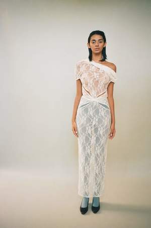 Long mesh lace dress with an exaggerated neckline that can be worn multiple ways. Cut out and knot design at the waist. Styled here with blue tights.