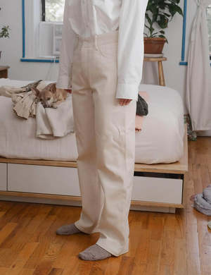 These organic canvas jeans are perfect pants to dress up or down. Made from 100% organic cotton and undyed. Details: - By BASERANGE - Undyed - Mid-rise - Organic cotton canvas material - 100% cotton - model size S - Cold wash, gentle