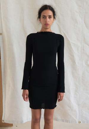 Organic cotton rib long sleeve dress. Features boatneck, exposed contrast seams, lettuce edge at neckline and hems COMPOSITION 91% Organic Cotton 9% Elastane GOTS, Oeko-Tex, OCS 100 Cotton SIZE & FIT Model wears a size S ABOUT BASERANGE Founded in 2012, Baserange creates modern, minimalist clothing with an emphasis on clean lines and easy silhouettes. The designs, the natural and recycled materials are made to withstand time. Since its inception, Baserange is committed to discovering and implementing innovative ways to reduce environmental impact at every stagefrom energy use to water consumption to dyes to packaging. The brand works closely and collaboratively with its producers to source and develop quality textiles from both natural fibers and recycled content. Baserange is constantly seeking better solutions across the industry and questioning its own practices with the goal of ecological and humane sustainability.