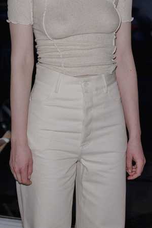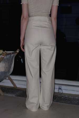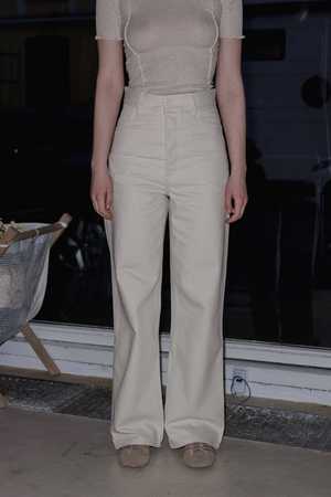 The Navalo Pants in Undyed by Baserange. Cotton canvas pant with a high rise and two front pockets with button closure. Sizing + Details - Made In Portugal - 50% Cotton, 25% Recycled Cotton, 25% Organic Cotton - Model Wears S