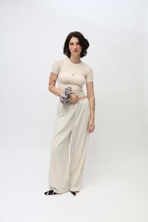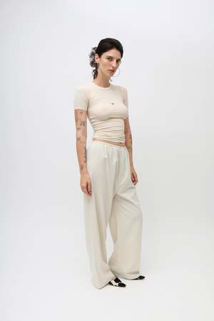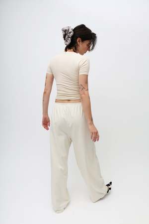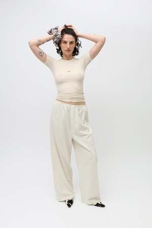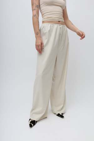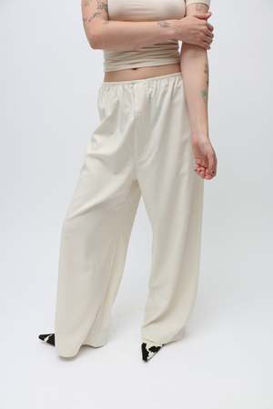 Undyed wild silk pants with an elastic waistband with a men's boxer inspired front placket. Designed for an oversized look.