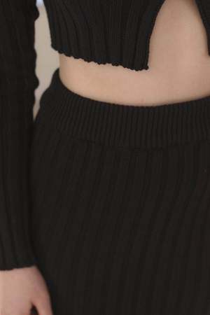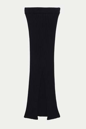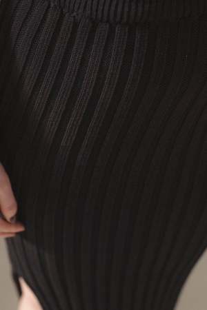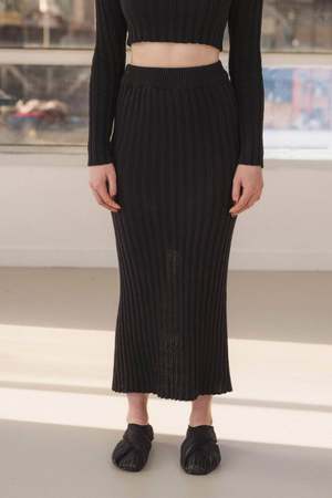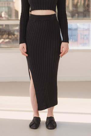 Cotton rib knit maxi skirt with a slit that can be worn on any preferred side. Comfortable elastic waistband for an easy pull-on style. Made in France. 100% GOTS, Oeko-Tex organic cotton. Cold wash gentle, hang to dry. Model wears a size S.