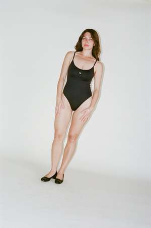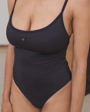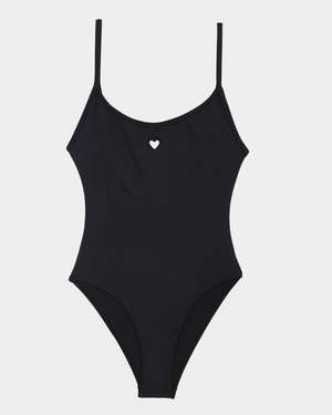 Baserange Heart Swimsuit in Black - Nylon swimsuit - Heart shape embroidery with cut out at front - Scoop neck - Elastic trim at straps and hem - Thin straps - Supportive for medium and small bust - Made using deadstock material - 95% Polyamide 5% Elastane - Made in Portugal - Please note: all swimwear is FINAL SALE.