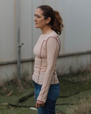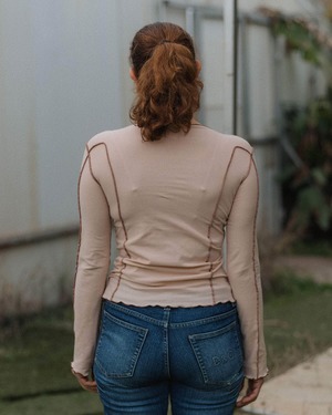 Organic cotton rib long sleeve with boatneck, exposed contrast seams, and lettuce edge at neckline and hems. Made by Baserange in France.