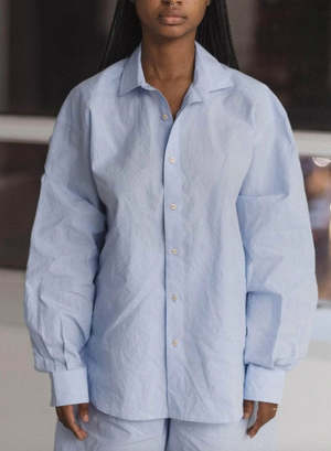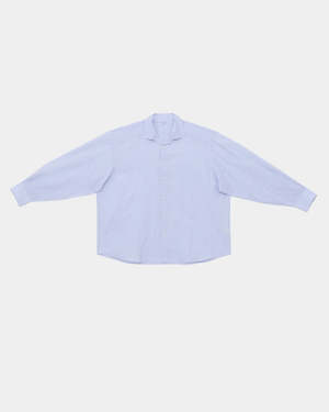 Technical cotton button-up shirt with a curved hem and a wide fit. Made with novelty cotton that has a paper-like crisp quality, the fabric undergoes a process that swells the fibers, increasing their volume and shrinking the fabric for added density. Model is wearing a size small. 100% Organic Cotton Made in Portugal.
