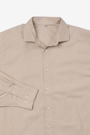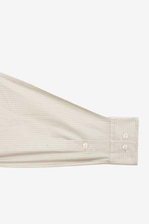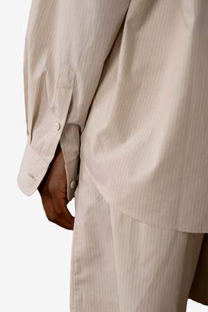 The Claude Shirt by Baserange features a classic button-up design with a curved hem. Style code: TSCL-PO-SP26. Color: Brown Stripe. Type: Apparel. Womens long sleeve shirt.