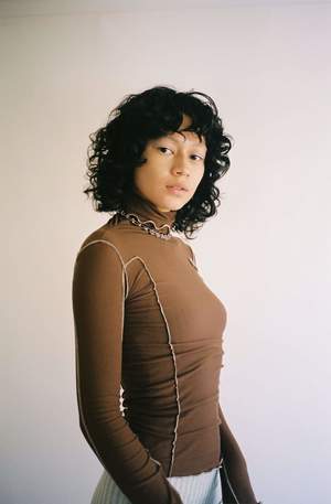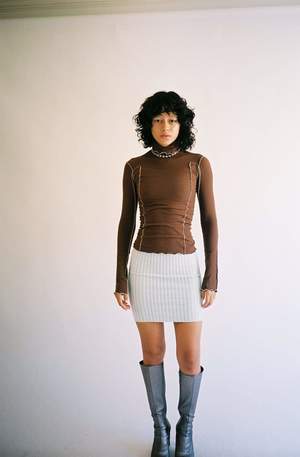 Formfitting, long sleeve tee shirt with turtleneck. Loam brown with ivory babylock finishing on all edges. Thin and soft rib fabric. Made from organic cotton in Portugal. Worn with the Hila Pant. The philosophy behind Baserange is to create clean, easy, and accessible garments that exist somewhere between modern culture and the natural world. Dari is 5'8" tall and measures 32A bust, 24 waist, and 35 hips, and wears a size M, for a little oversized fit. Fabrication is 100% Sandwashed Silk. Made in Turkey.