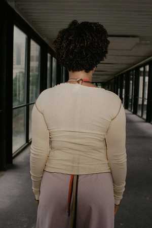 The Vein Long Sleeve in Mom Sand by Baserange. A fine organic cotton rib long sleeve with a boatneck and exposed seams, lettuce edge at neckline and hems. This style runs small, consider sizing up. Sizing + Details - Made In Portugal - 100% Organic Cotton - Model Wears S