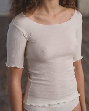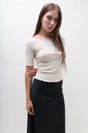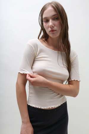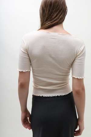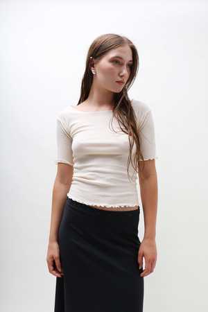 Fine cotton rib length sleeve tee. Boatneck, with lettuce edge at neckline and hems. In color Off White. Made from ribbed organic cotton in Portugal. The philosophy behind Baserange is to create clean, easy and accessible garments that exist somewhere between modern culture and the natural world.