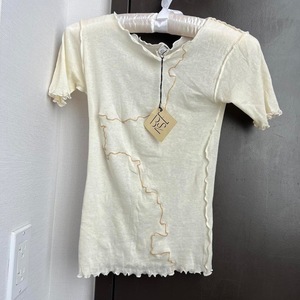 Form-fitting semi-sheer top done in undyed organic cotton. features a wide boatneck, exposed seams, and a lettuce edge along the neck, cuffs and hemline. Made in Portugal 100% Certified Organic Cotton Brand New never worn with tags $142 retail - NWT