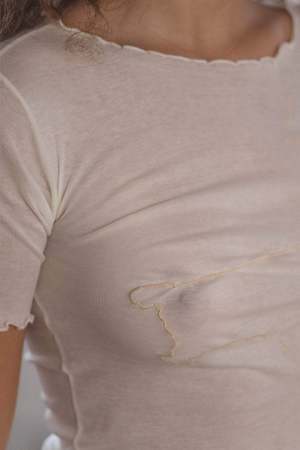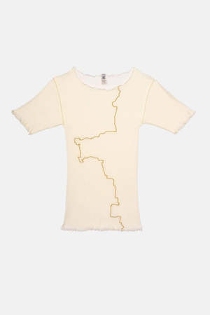 Organic cotton tee with exposed seams and lettuce edge at neckline and hems. Features undyed fabric. The embroidery represents a gerrymandered electoral district, a constituency that is manipulated to favor a certain demographic group to give a political party an advantage. Model wears size S and is 172cm tall. 100% Organic Cotton Made in Portugal.