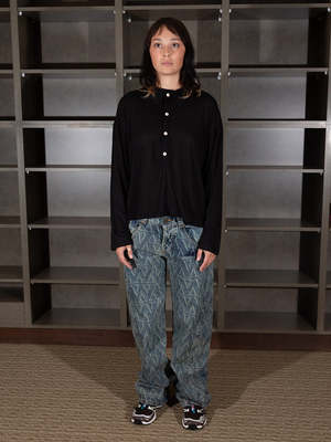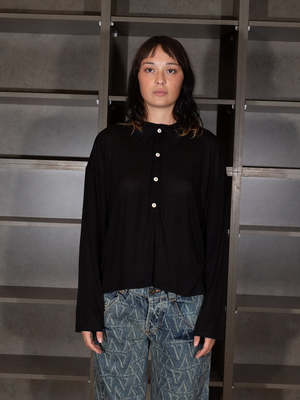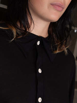 Long-sleeved, boxy polo top with 3/4 length sleeves. Designed to be loose and oversized for a fresh take on a classic style. The bamboo lyocell textile drapes well.