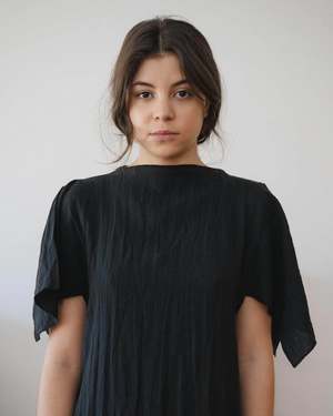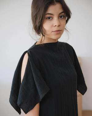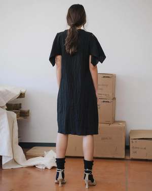 Crinkle linen dress with a boat neck and slits on the sleeves at the shoulder. 74% Linen, 26% Organic Cotton. Made in Trkiye. Model wears a size S and is 171 cm tall.
